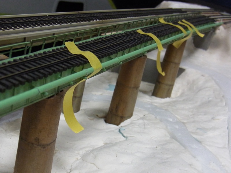 上り線のガーター橋に水道管?を設置。3ミリのプラ丸棒です。